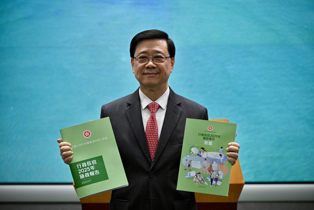特首李家超今早(9月16日)出席行政会议前见记者,展示明日发表的《施政报告》封面,及介绍部分主题内容。他介绍道,今年主题是“深化改革 心系民生 发挥优势 共创未来”。