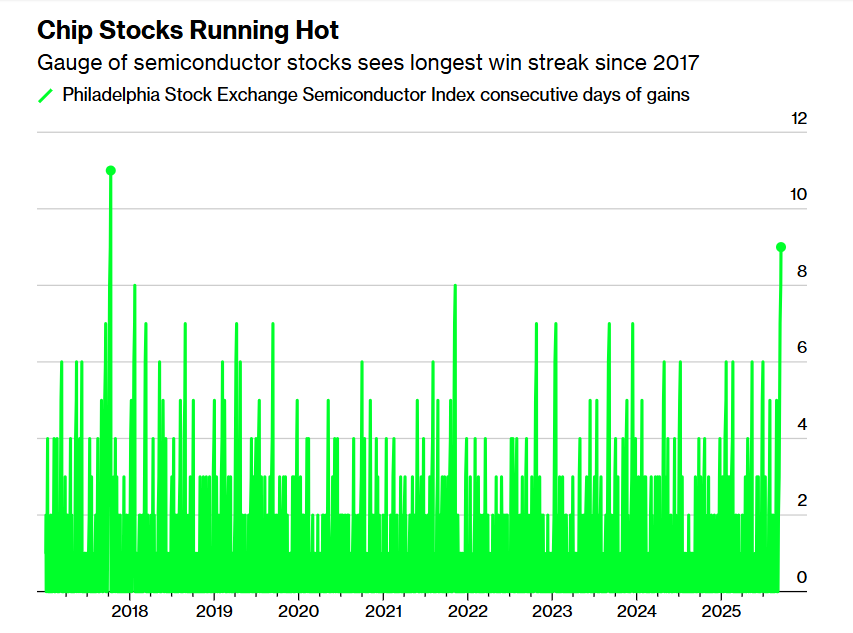 截至周二美股收盘,美股芯片股基准指数——同时也被投资者们视为“全球芯片股风向标”的费城证券交易所半导体指数虽然仅仅上涨0.3%,但这是该基准指数实现连续九个交易日上涨,创下自2017年以来持续时间最长的连涨。该指数在这九个交易日期间累计上涨8.7%,年内涨幅则高达22%,大幅跑赢同期涨幅接近16%的纳斯达克100指数。
