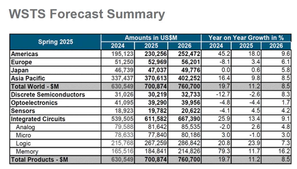 WSTS预计继2024年强劲反弹之后,2025年全球半导体市场将增长11.2%,总价值将达到7009亿美元,主要得益于GPU主导的逻辑芯片领域以及HBM主导的存储领域持续强劲的势头,预计这两个领域都将实现强劲的两位数增长,这得益于人工智能推理系统、云计算基础设施和前沿消费电子等领域的持续强劲需求。