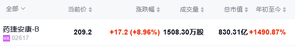 按6月23日上市13.15港元/股的发行价算,上市仅87天的药捷安康,股价已上涨1490.87%。