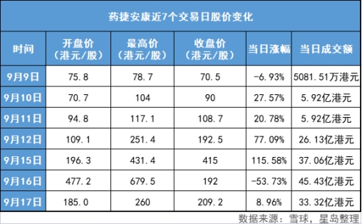若聚焦最近一周,从股价暴涨前夕,即9月9日70.5港元/股的收盘价,到暴跌后9月17日209.2港元/股的收盘价,药捷安康一周的股价涨幅已达196.74%,期间最高的单日交易额达45.43亿港元。