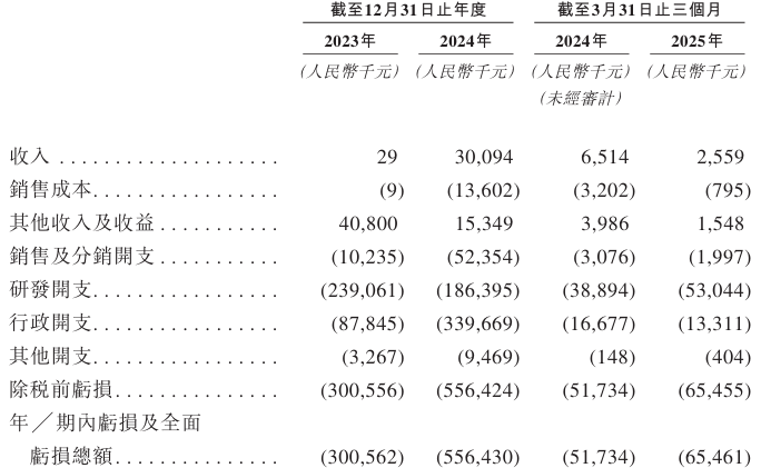 财务方面,于2023年、2024年及2025年截至3月31日止三个月,该公司收入分别为2.9万元、3009.4万元、255.9万元人民币;同期,研发开支分别约为2.39亿元、1.86亿元、5304.4万元人民币。