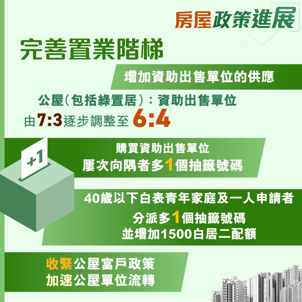 行政长官李家超昨日(17日)公布新一份《施政报告》,同时也公布了之前各项KPI的进度。 房屋局局长何永贤今日(18日)在社交平台发文指,当中有不少房屋相关内容,故摘录主要内容与公众分享,让市民进一步了解当局扭转公营房屋头轻尾重的情况。 何永贤表示会继续努力,落实好房屋政策。