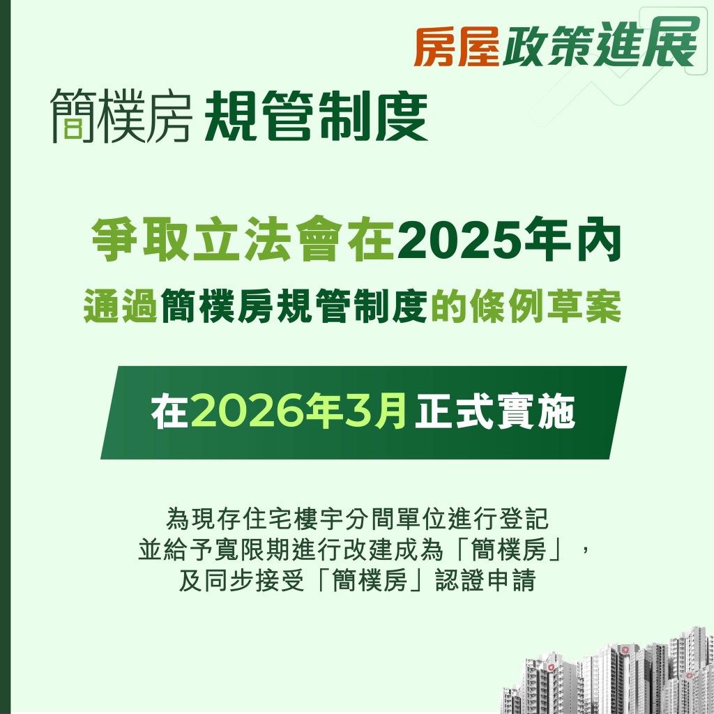何永贤指,本届政府将综合轮候公屋时间下降至5.1年;以快速兴建的方式,为有迫切住屋需要的市民提供3万个简约公屋;增加资助出售单位供应;助力青年置业;收紧富户政策;促进建筑科技应用;推动智慧屋邨管理;推行“共筑. 创业家计划,与商界携手支持青年实践创业梦想; 争取立法会今年内通过简朴房规管制度的条例草案。