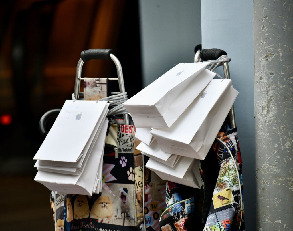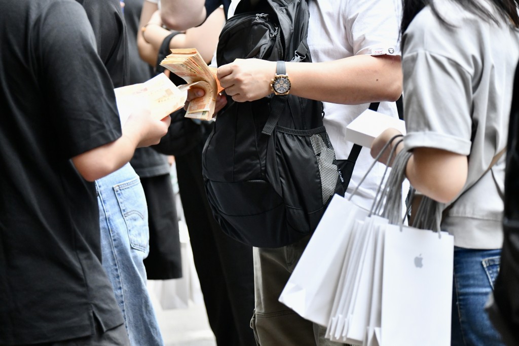 iPhone17系列今早(19日)8时开售,希慎Apple Store外逾百人排队,场面热闹。首批买家取机后,Apple Store场外随即变身交易现场,有不少本地、内地及东南亚人士,手持一叠叠现金收机。