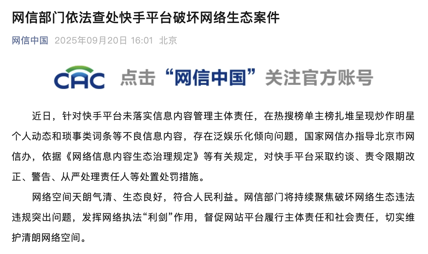 9月20日,快手平台发布公告,回应快手平台被网信部门约谈: