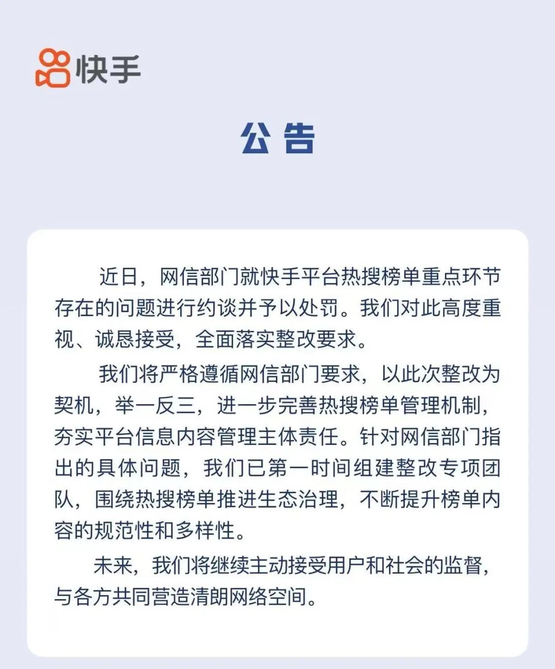 近日,针对快手平台未落实信息内容管理主体责任,在热搜榜单主榜扎堆呈现炒作明星个人动态和琐事类词条等不良信息内容,存在泛娱乐化倾向问题,国家网信办指导北京市网信办,依据《网络信息内容生态治理规定》等有关规定,对快手平台采取约谈、责令限期改正、警告、从严处理责任人等处置处罚措施。