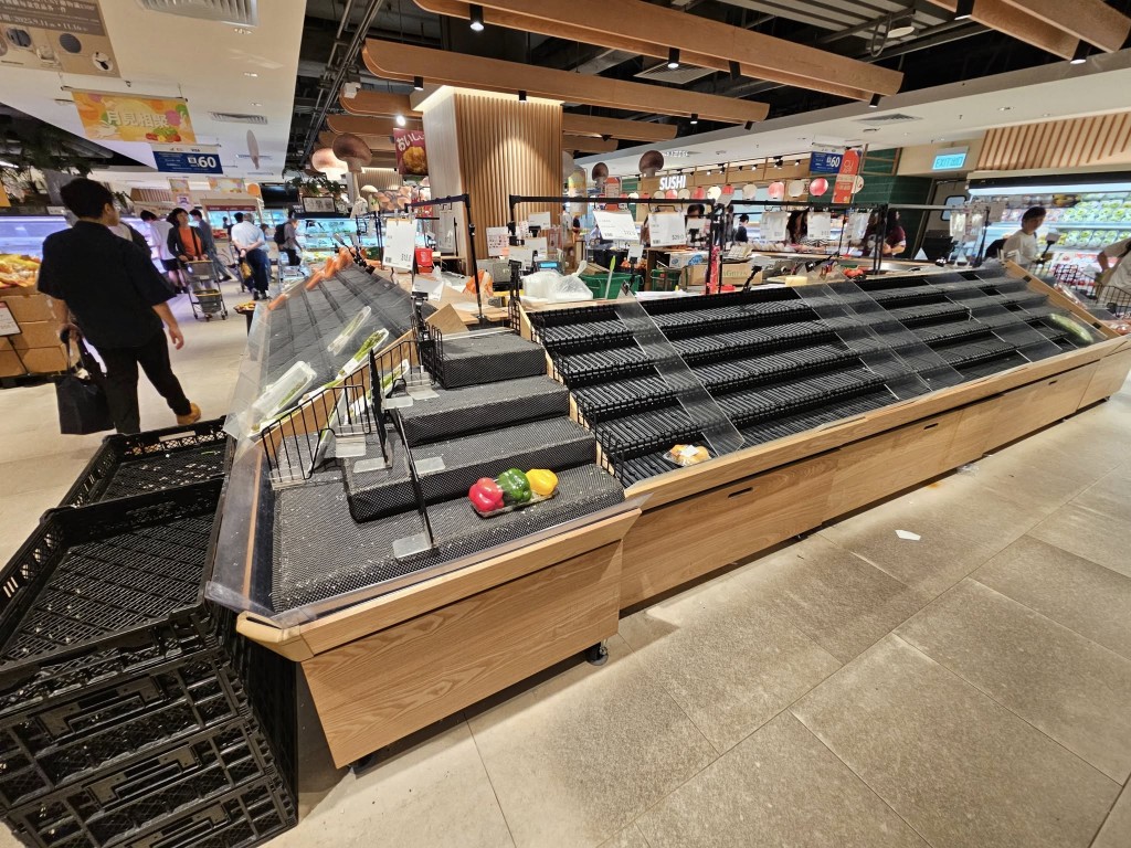 有网民更以“惨不忍睹”形容超市一些货架被扫光情况,综合网民报料,菜架、肉架、面包、即食面及樽装水均成为抢货目标,多区超市相关货架几近清仓,楼主在帖文中惊讶地表示:“究竟系我自己太淡定or香港人太紧张?连水都抢购一空。”