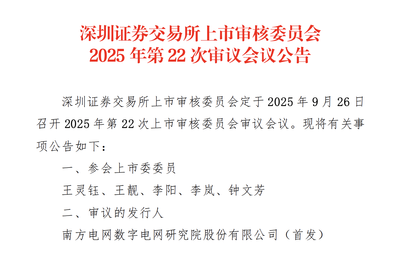 9月19日,据深交所公告,深交所上市审核委员会定于2025年9月26日召开2025年第22次上市审核委员会审议会议,届时将审议南方电网数字电网研究院股份有限公司(以下简称:南网数字)的首发事项。