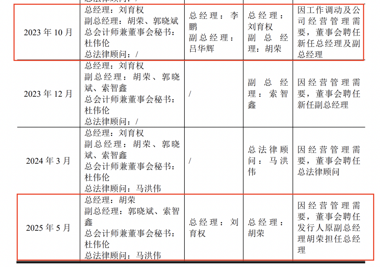 据瑞财社查阅,2023年10月,因工作调动及公司经营管理需要,董事会聘任新任总经理刘育权,原总经理李鹏离职;2025年5月,因经营管理需要,董事会聘任公司原副总经理胡荣担任总经理,刘育权卸任总经理一职。