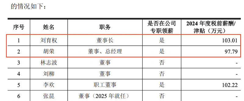 2024年,刘育权、胡荣薪酬分别为103.01万元、97.79万元。