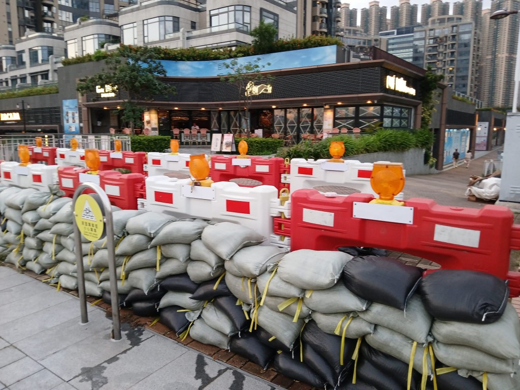 超强台风“山竹”2018年袭港时重创将军澳海滨长廊,如今再面对另一股超强台风“桦加沙”,政府与附近居民都严阵以待。附着水马的双重沙包阵,已妥妥的放在两边大路出入口。沙包静观昨日暴风雨前夕的落霞,大有笑看风云的气概。详情见下图及下文: