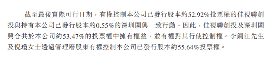 IPO前,李钢江、倪琼夫妇通过佳佳控股旗下的佳视联私募控制的包括佳视联创投等多家实体合计持股55.09%,深圳阖兴持股0.55%,并与佳视联创投一致行动。控股股东合计持股55.64%。