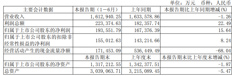 报告显示,宇通客车公司上半年营业收入为161.29亿元,同比下降1.26%;归母净利润为19.36亿元,同比增长15.64%;扣非归母净利润为15.50亿元,同比增长8.24%;基本每股收益0.87元。