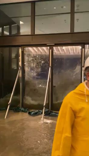 超强台风桦加沙袭港,有网民拍得位于港岛南区的香港富丽敦海洋公园酒店,遭巨浪冲爆玻璃窗,大量海水涌入酒店大堂内,其间有人被海水冲跌,一片混乱。