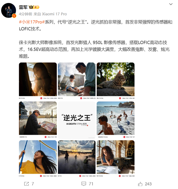 “小米17 Pro系列代号‘逆光之王’,逆光抓拍非常强,首发非常强悍的传感器和LOFIC技术”,雷军表示。
