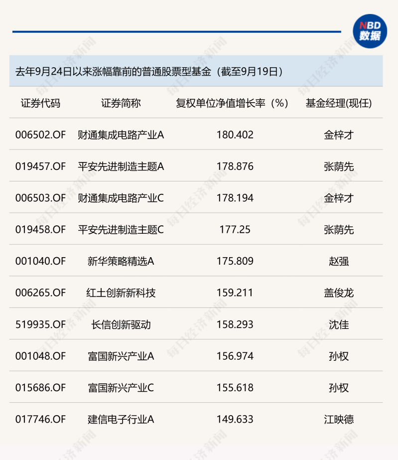 Wind数据显示,截至9月18日,从去年9月24日开始,已经有429只偏股混合型基金、112只普通股票型基金的区间业绩超过100%,主要来自投资实力较强的头部公募。