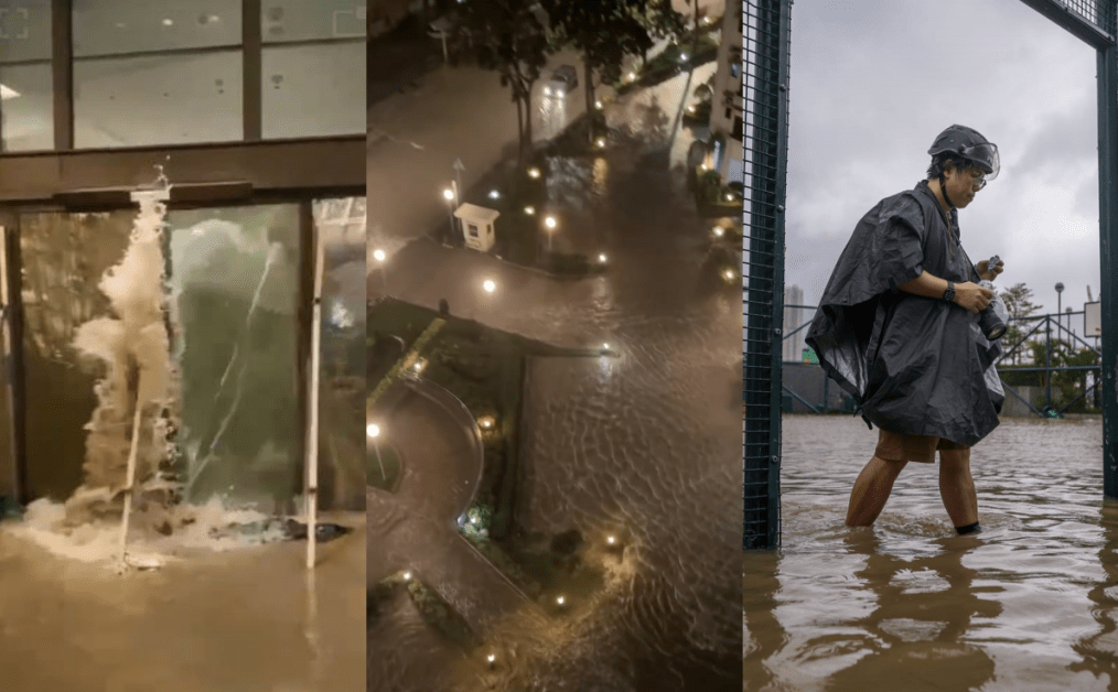 超强台风桦加沙从香港南面掠过,港岛南区首当其冲。有网民拍得位于港岛南区的香港富丽敦海洋公园酒店,遭巨浪冲爆玻璃门,大量海水涌入酒店大堂内,期间有人被海水冲跌。