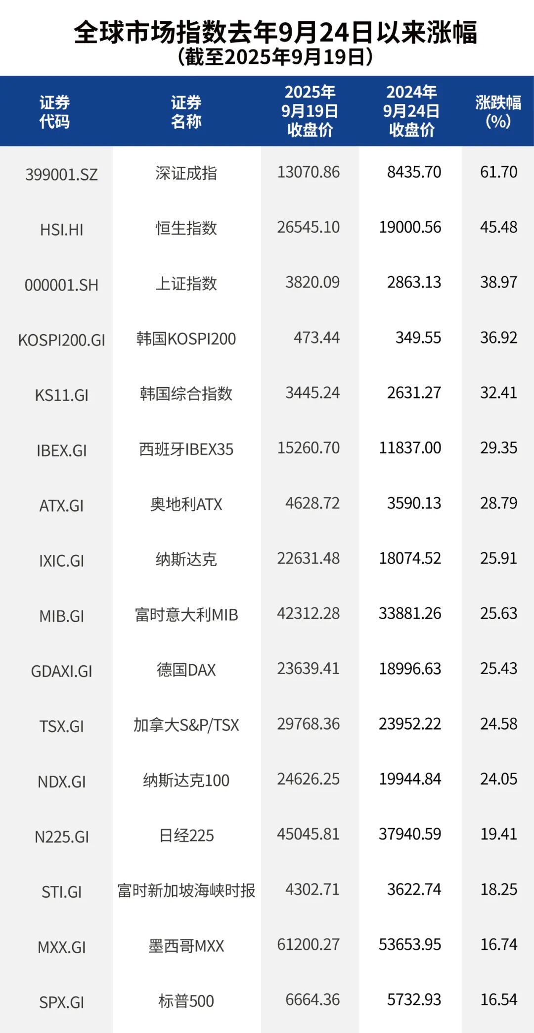东方财富Choice数据显示,去年9月24日以来,截至2025年9月中旬,深证成指累计涨幅高达61.7%,分别超出纳斯达克综合指数(25.91%)、日经225指数(19.41%)逾30个百分点;恒生指数年内涨幅突破45%,较标普500指数(16.54%)的领先优势超过20个百分点,中国资产的全球配置价值进一步凸显。