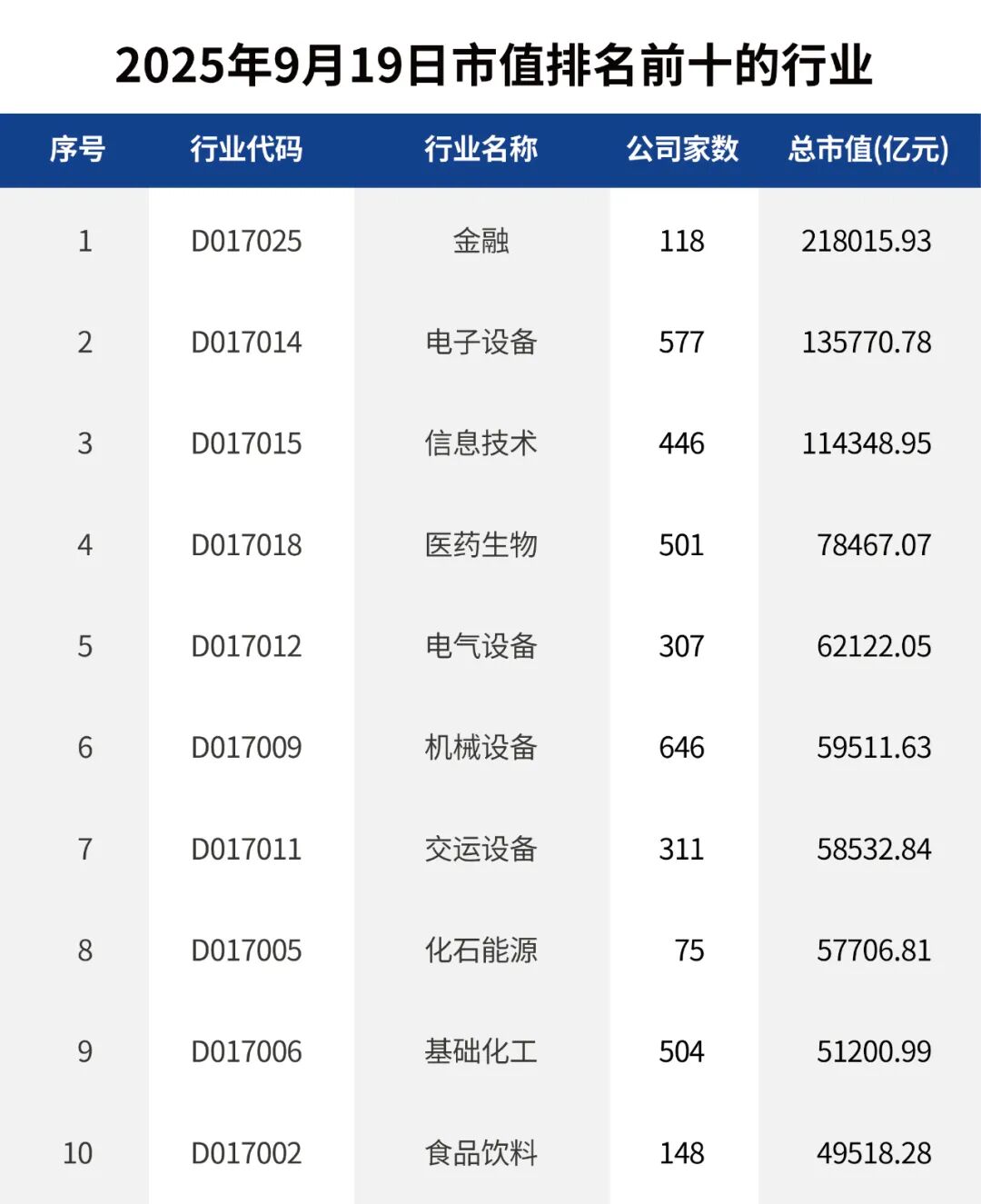 从上述表格可清晰地看出,2024年9月24日到2025年9月19日,金融行业总市值从17.42万亿元增至21.8万亿元,增幅25.18%,继续稳居行业首位,“压舱石”作用凸显。电子设备行业表现更为抢眼,总市值从6.37万亿元跃升至13.58万亿元,增幅113%,排名从第三升至第二;信息技术行业市值增长60.13%,两大科技板块成为增长引擎。