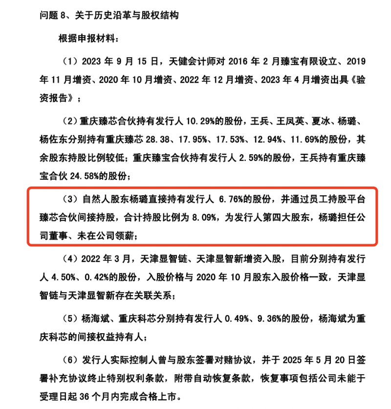 根据申报材料,自然人股东杨璐直接持有公司6.76%的股份,并通过员工持股平台臻芯合伙间接持股,合计持股比例为8.09%,为公司第四大股东,杨璐担任公司董事、未在公司领薪。