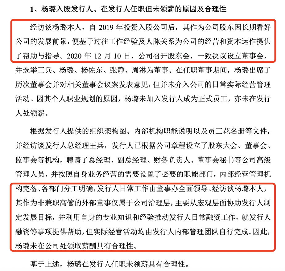 同时,杨璐作为非兼职高管的外部董事仅属于公司治理层,主要从宏观层面协助公司制定发展目标,并利用自身的专业知识和经验推动公司日常融资工作,就公司融资等事项提供帮助,但实际经营活动均由公司内部管理团队自行完成。因此,杨璐未在公司处领取薪酬具有合理性。
