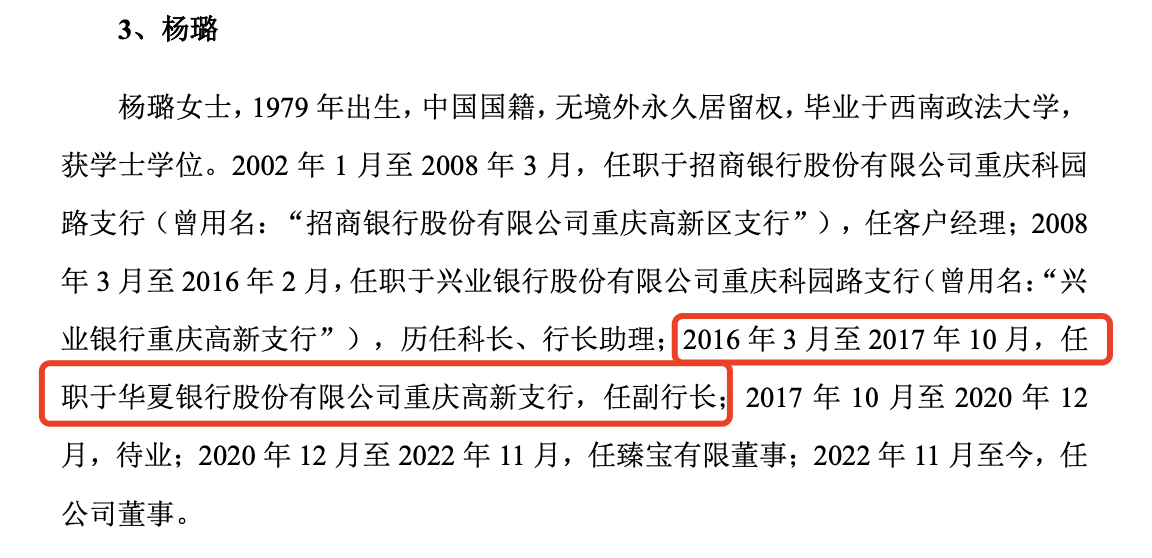 资料显示,杨璐,女,1979年出生,中国国籍,无境外永久居留权,毕业于西南政法大学,获学士学位。2002年1月至2008年3月,任职于招商银行股份有限公司重庆科园路支行(曾用名:“招商银行股份有限公司重庆高新区支行”),任客户经理;2008年3月至2016年2月,任职于兴业银行股份有限公司重庆科园路支行(曾用名:“兴业银行重庆高新支行”),历任科长、行长助理;2016年3月至2017年10月,任职于华夏银行股份有限公司重庆高新支行,任副行长;2017年10月至2020年12月,待业;2020年12月至2022年11月,任臻宝有限董事;2022年11月至今,任公司董事。