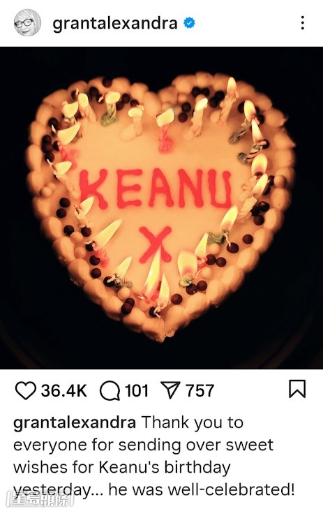 虽然婚讯被证实是谣传,令粉丝们都颇感失望。 但奇洛与Alexandra至今拍拖6年依然恩爱,就值得庆贺。 在本月2日,奇洛迎来61岁生日,Alexandra翌日在IG上载一张写有“Keanu”字样的生日蛋糕照,并写道:“我非常感激你的爱与陪伴。”由于奇洛没有社交账号,Alexandra更俨如贤内助般代他感谢网友们的生日祝贺,的确甜到漏! 最近奇洛又与好友Alex Winter合演舞台剧《等待果陀》(Waiting for Godot),Alexandra不但落力捧场,更以半个主人家身份替他招待到来观剧的好友们如时装设计师Stella McCartney等,可见两人感情极好,真的就只欠一张婚书而已。