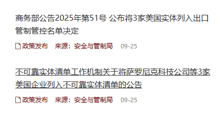 商务部公告2025年第51号 公布将3家美国实体列入出口管制管控名单决定
