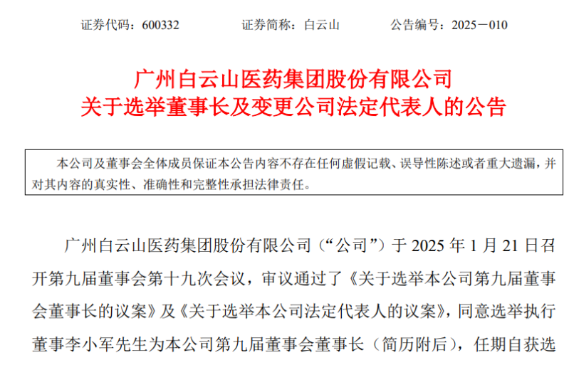 白云山1月21日公告,公司于 2025 年 1 月 21 日召开第九届董事会第十九次会议,审议通过了《关于选举本公司第九届董事会董事长的议案》及《关于选举本公司法定代表人的议案》,同意选举执行董事李小军为本公司第九届董事会董事长,任期自获选举之日起至第九届董事会任期届满之日止;同时根据《公司章程》的有关规定,公司的法定代表人变更为李小军。