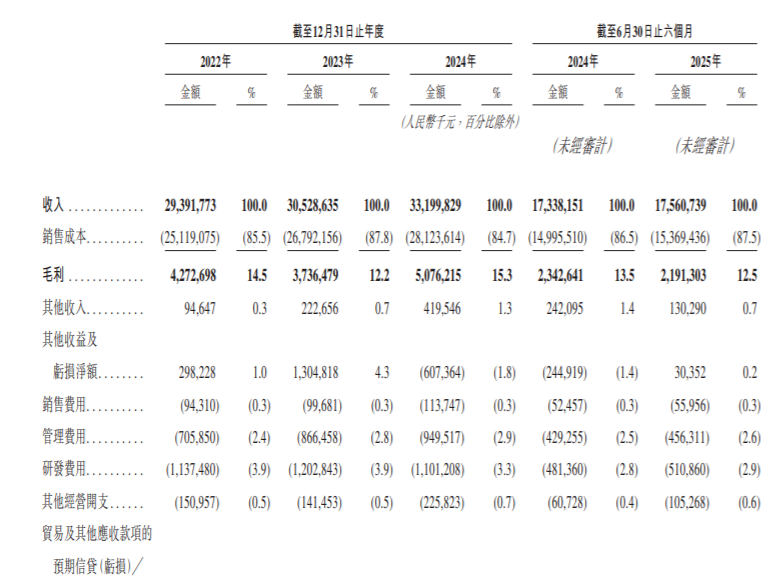 业绩方面,于2022年度、2023年度、2024年度及2025年截至6月30日止六个月,公司实现收入293.92亿元、305.29亿元、332亿元、175.61亿元;同期,年/期内利润分别约为13.32亿元、11.62亿元、13.28亿元、8.43亿元。