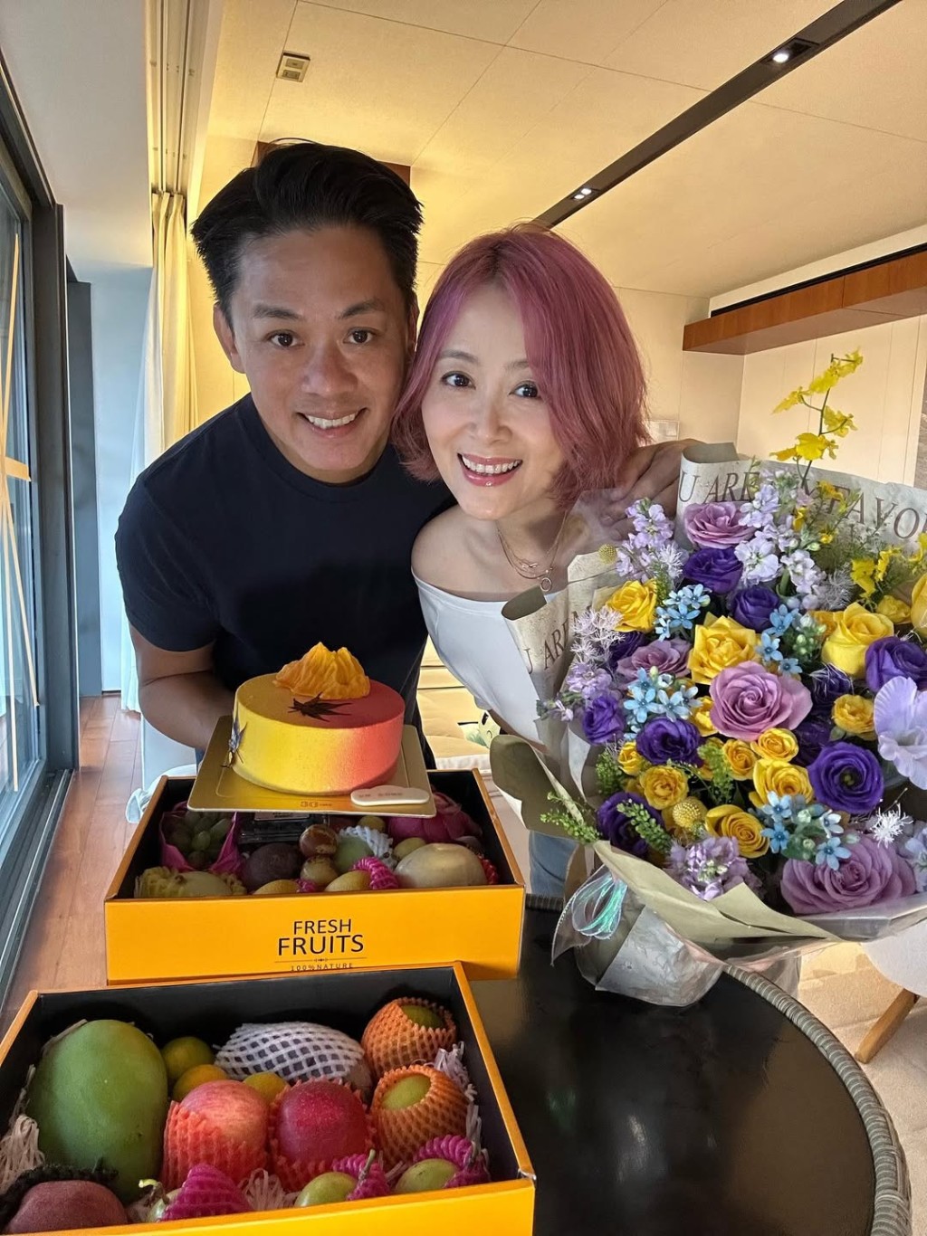 姚乐怡虽然在家中度过生日,但要有的都有,不但收到花束,还有两盒包装精美的生果礼盒,以及蛋糕。姚乐怡分享与老公的合照外,还有与囡囡一家三口的照片。姚乐怡之后又在IG限时动态上载影片,坐在家中独食蛋糕,还露出满足表情。