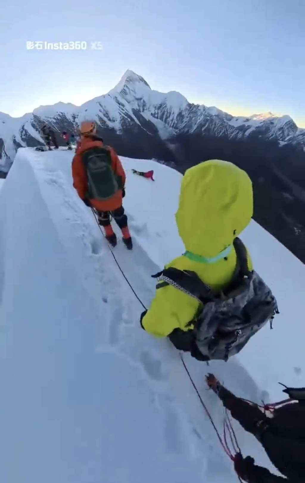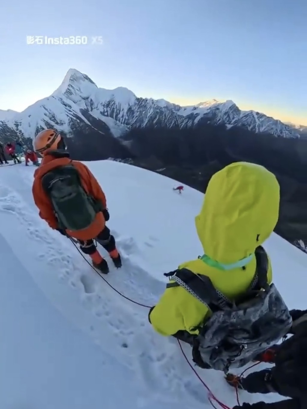 影片显示,一队登山者于雪峰行进期间,一名身穿红色衣服的蹲姿者起身时突然失足前倾,瞬间滑坠并消失于镜头外。相关影片迅速引起网民对坠崖者安危的关注。