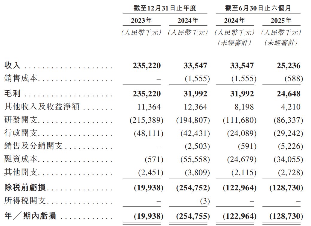 于往绩记录期间,公司收入主要来自对外许可收入及医药产品销售。截至2023年、2024年12月31日止年度及2025年6月30日止六个月,公司分别产生亏损约1.99亿元、2.55亿元及1.29亿元,主要由于持续的研发投入。