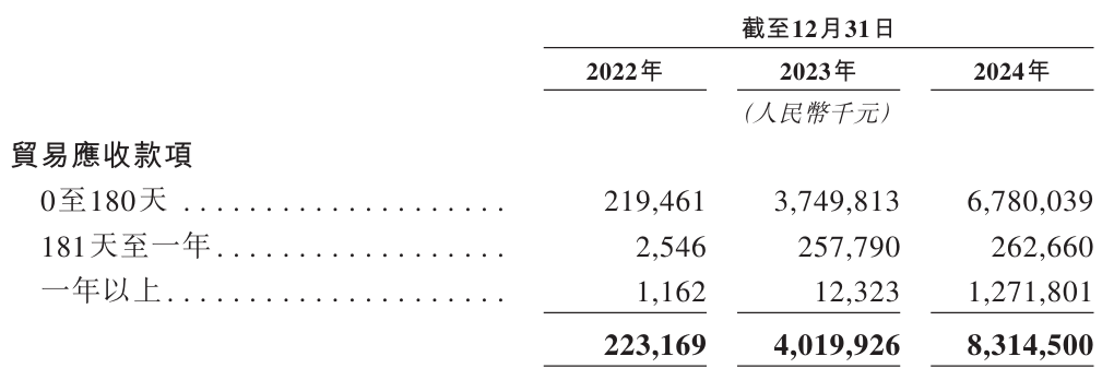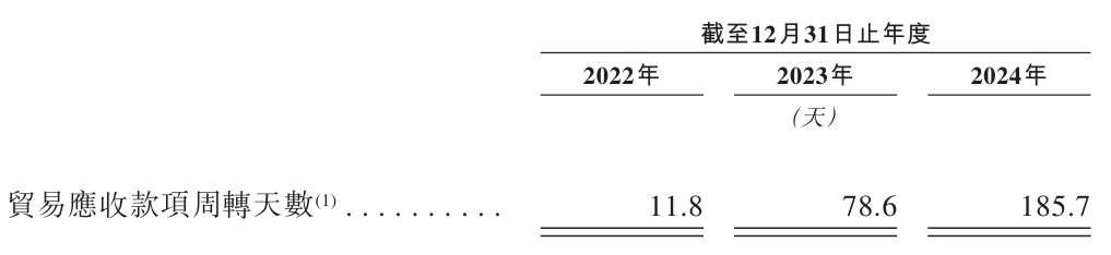 据此计算,海辰储能2024年的贸易应收款项占其总收入的比例高达69.5%,这也意味着该公司收入金额中有近七成将被用作赊账。同时,海辰储能的应收账款周转天数也由2022年的11.8天延长至2024年的185.7天,回款风险高企。