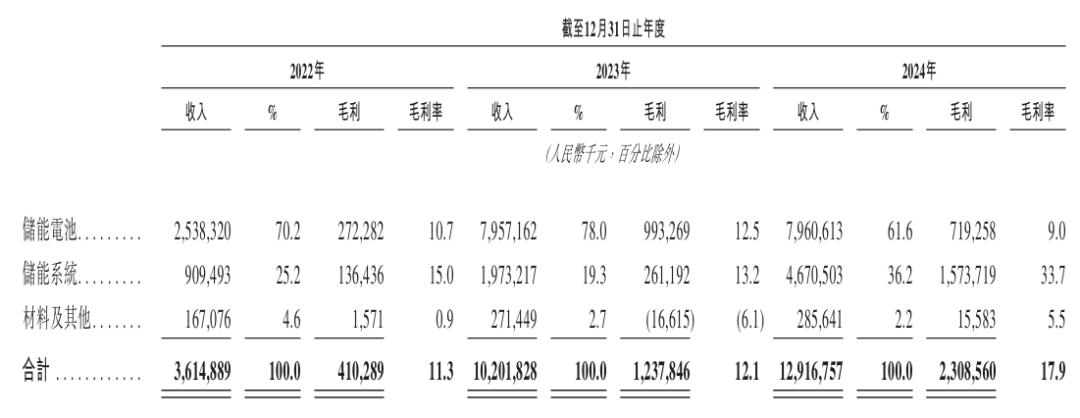 好在海辰储能的储能系统业务毛利在2024年实现了502.5%的显著增长,来到15.37亿元,毛利率也由13.2%翻倍提升至33.7%,这才提振了该公司的整体水平,使其毛利率同比增长5.8个百分点至17.9%。