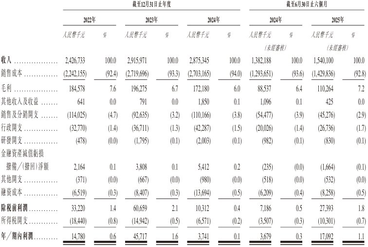 业绩方面,2022年、2023年、2024年及2025年截至6月30日止六个月,该公司实现收入分别约为24.27亿元、29.16亿元、28.75亿元及15.40亿元人民币;同期,年内/期内利润为1478万元、4571.7万元、374.1万元以及1709.2万元人民币。