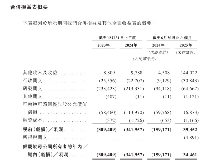 业绩方面,于2023年、2024年及2025年截至6月30日止六个月,该公司实现其他收入及收益分别约为880.9万元、978.8万元、1.44亿元人民币;同期,年/期内利润约为-3.09亿元、-3.42亿元、3446.1万元人民币。