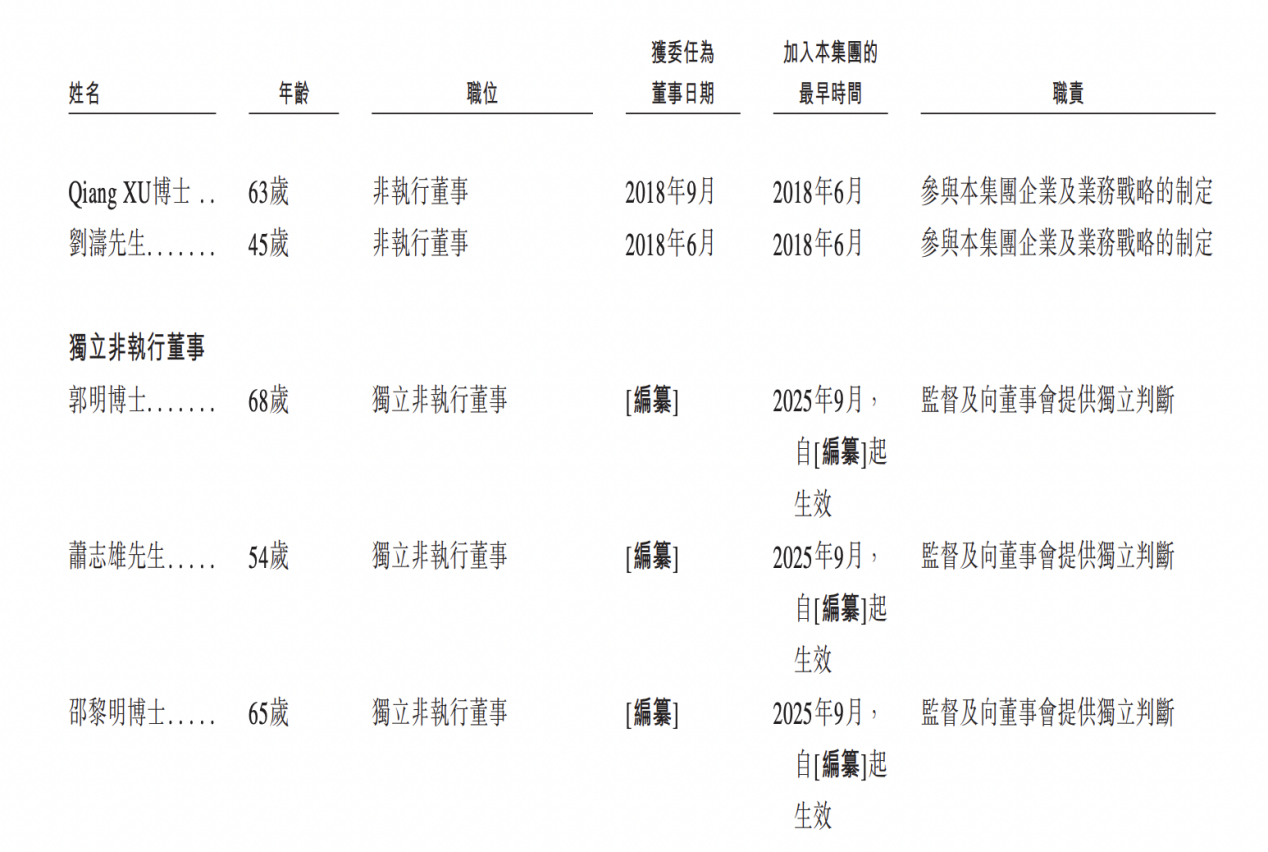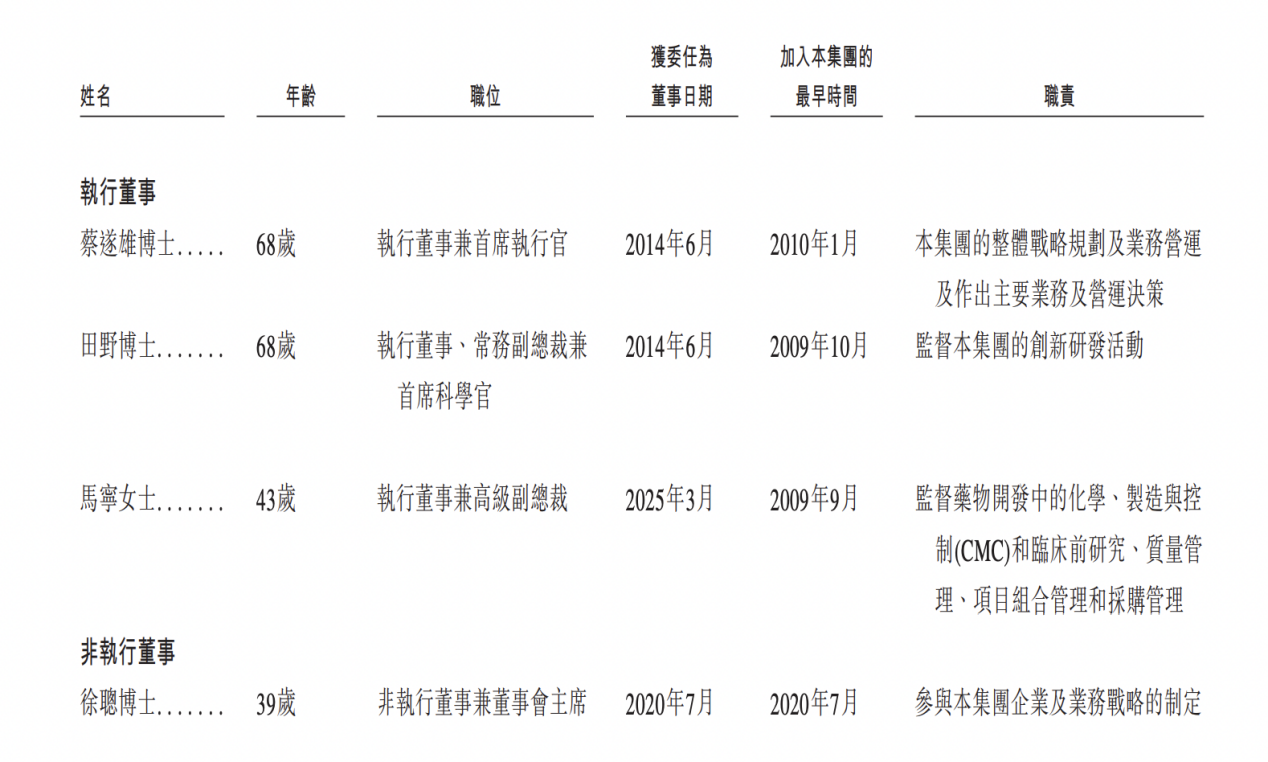 英派药业的董事会由九名董事组成,年龄横跨39岁至68岁。其中,5名董事年过六旬,包括68岁执行董事兼首席执行官蔡遂雄,68岁执行董事、常务副总裁兼首席科学官田野,63岁非执行董事Qiang XU,68岁独立非执行董事郭明,65岁独立非执行董事邵黎明。