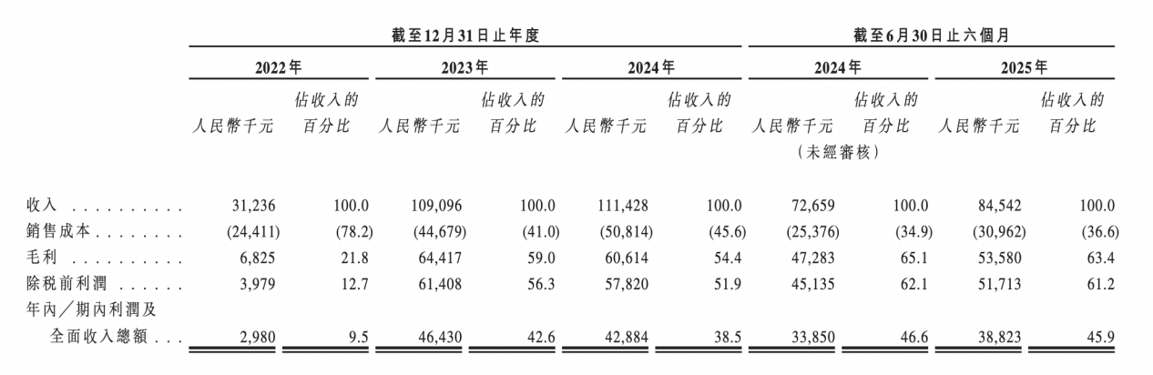 2022年至2024年,瘦西湖收入分别为3123.6万元、1.09亿元、1.11亿元,期内利润及全面收入总额分别为298万元、4643万元、4288.4万元,毛利率分别为21.8%、59%、54.4%。