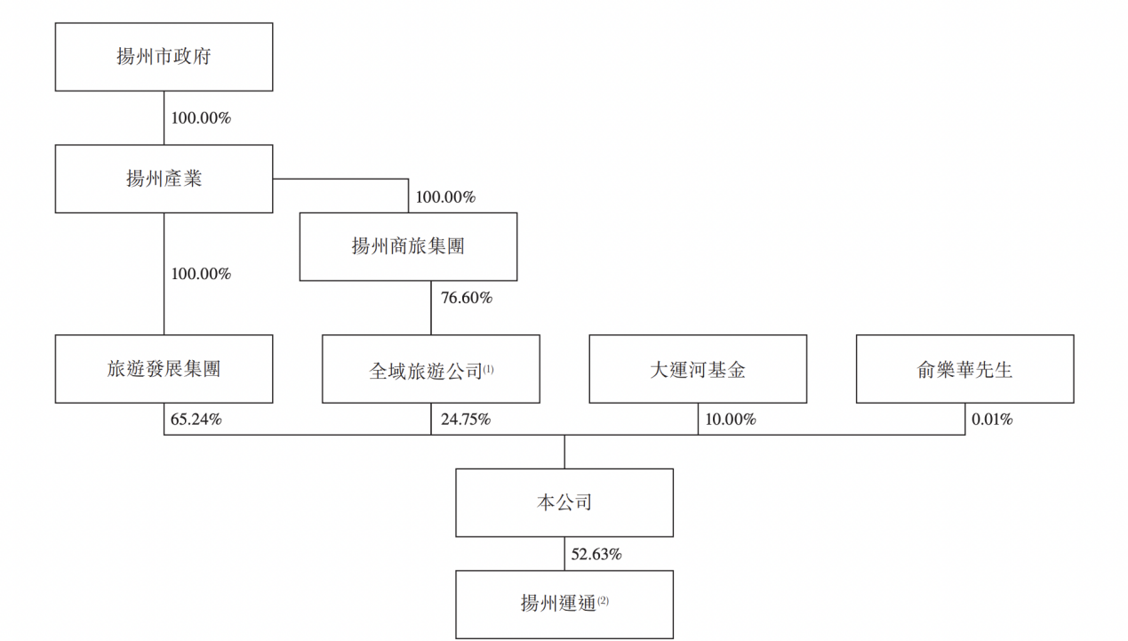 最后实际可行日期,扬州市政府旗下旅游发展集团、全域旅游公司合计持股约89.99%,为控股股东。江苏国资基金大运河基金持股10%。俞乐华持股0.01%。