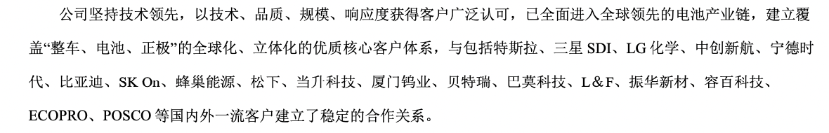 值得一提的是,公司已全面进入全球领先的电池产业链,建立覆盖“整车、电池、正极”的全球化、立体化的优质核心客户体系,与包括特斯拉、三星SDI、LG化学、中创新航、宁德时 代、比亚迪、SK On、松下等国内外一流客户建立了稳定的合作关系。