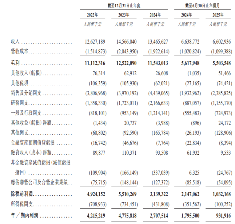 业绩方面,2022年、2023年、2024年和2025年前六个月,长春高新的营业收入分别为126.27亿、145.66亿、134.66亿和66.03亿元,相应的净利润分别为42.15亿、47.76亿、27.08亿和9.32亿元。