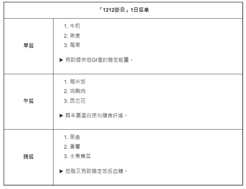 该55岁患者由高风险的168断食法,转为更安全的1212断食法——即每日空腹12小时、进食12小时,将进食时段安排在早上6点到晚上6点。 这样能让胰脏获得足够休息,避免空腹时间过长可能引发的低血糖。 薛晓晶建议,糖尿病患者可采用以下的“1212断食”1日餐单: