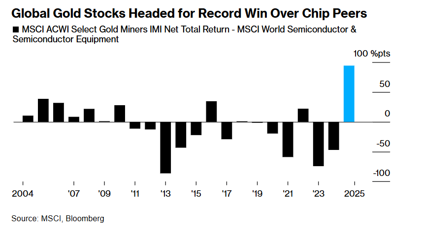 ▲在今年,全球黄金股有望创纪录地大幅跑赢芯片股