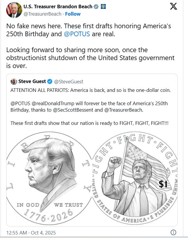 比奇在X平台上表示,这些硬币图像是真实的,并称一旦“美国政府的阻挠性关门结束”,他期待分享更多信息。