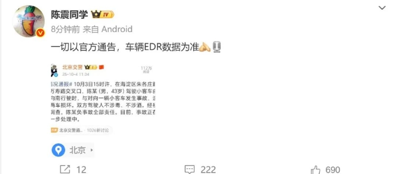 随后,陈震转发北京交警情况通报,并发文称:“一切以官方通告,车辆EDR数据为准。”