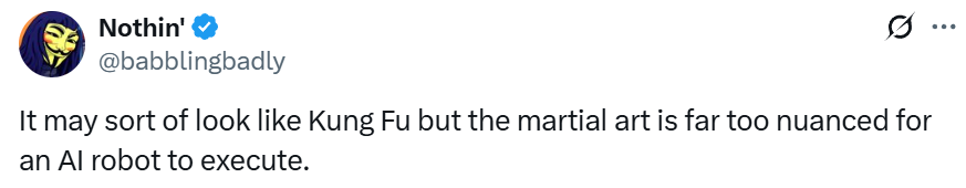 但也有网友表示,“这看起来或许有点像功夫,但武术的精妙程度远非AI机器人所能掌握。”