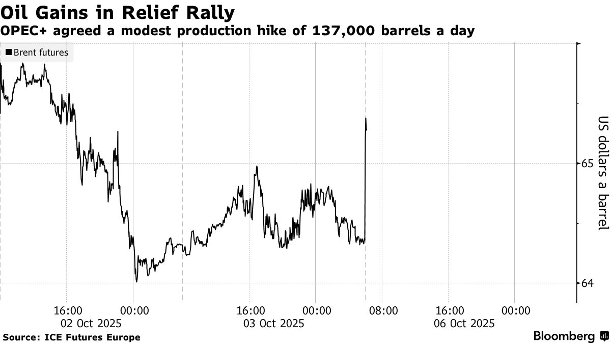 当地时间10月5日,OPEC+同意11月小幅增加原油产量,增产幅度为13.7万桶/日。此举缓解了交易员对超大规模增产的担忧,油价周一开盘走高。截止发稿,布伦特原油涨0.93%,报65.13美元/桶;WTI原油涨0.94%,报61.45美元/桶。