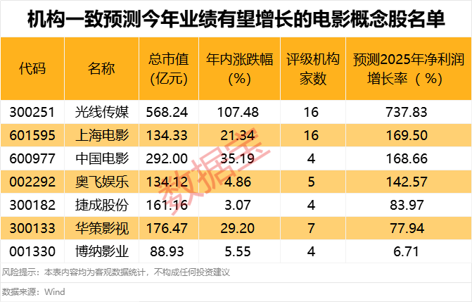 从业绩预期来看,7只获得超3家机构给予评级的电影概念股2025年全年业绩有望增长,其中光线传媒、上海电影、中国电影、奥飞娱乐的净利润有望实现翻倍。